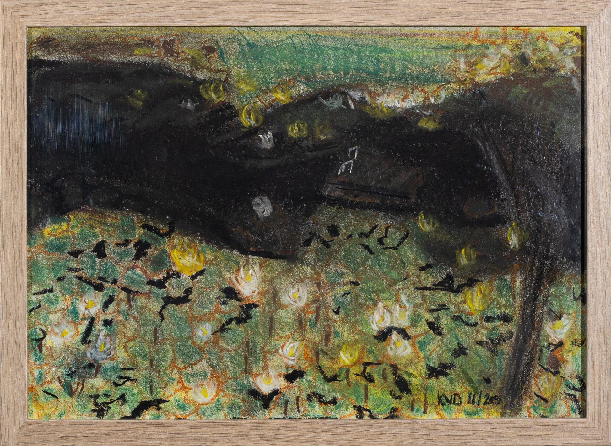Memory drawing of Goonarook Lagoon,Vacey NSW. Capturing the beauty and vibrant colour of the waterlilies surrounding the dark water surrounding the floating yet sturdy safety of the pontoon